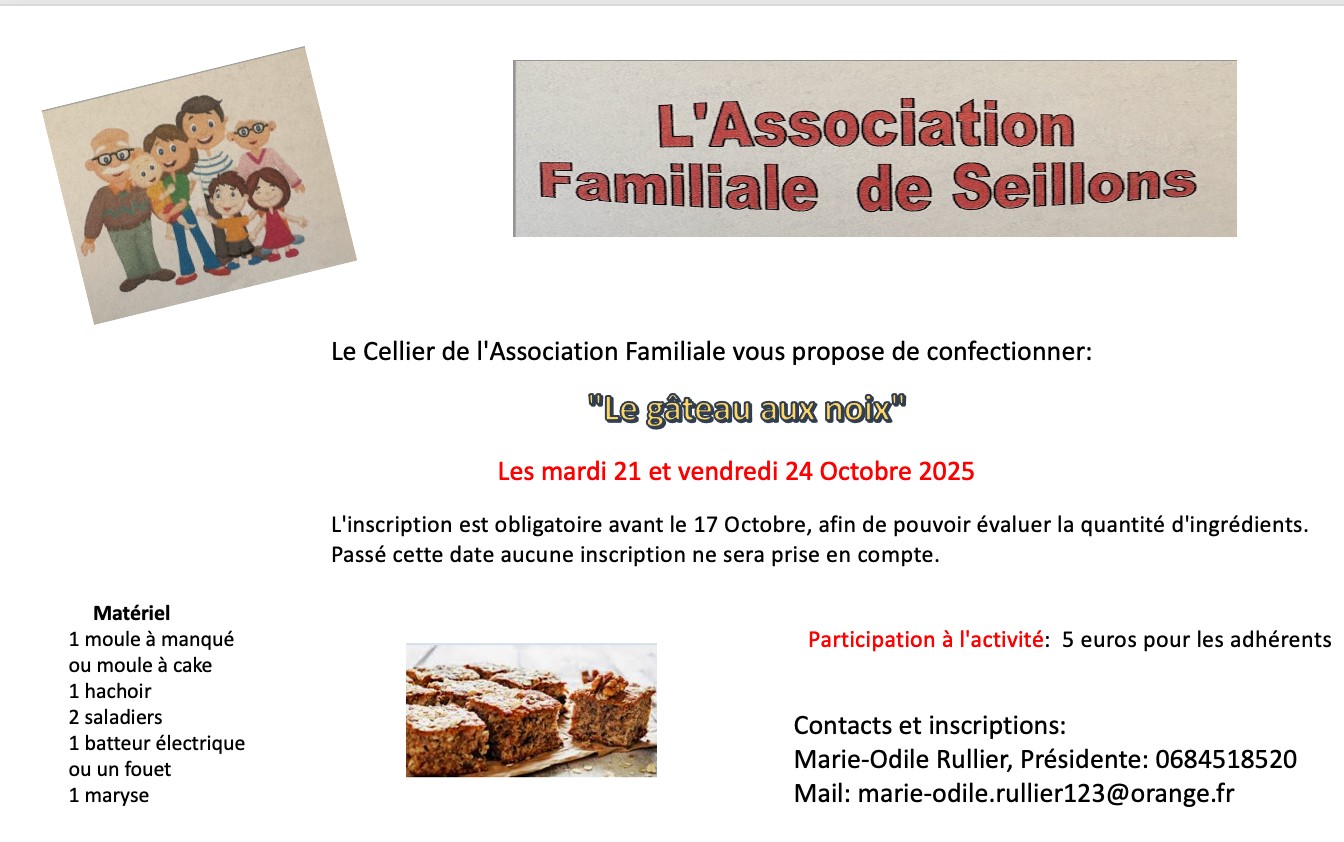 L’équipe du Cellier de l’association familiale vous invite à son atelier culinaire d’octobre, pour apprendre à préparer un savoureux gâteau aux noix qui ravira petits et grands !