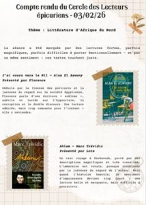Lors de leur rencontre de février, les membres du Cercle des lecteurs ont entamé un voyage à travers les littératures du monde. Première escale : l’ Afrique du Nord, avec des lectures fortes — parfois magnifiques, parfois difficiles à porter émotionnellement — mais toutes animées d’un même pouvoir : celui de toucher juste.