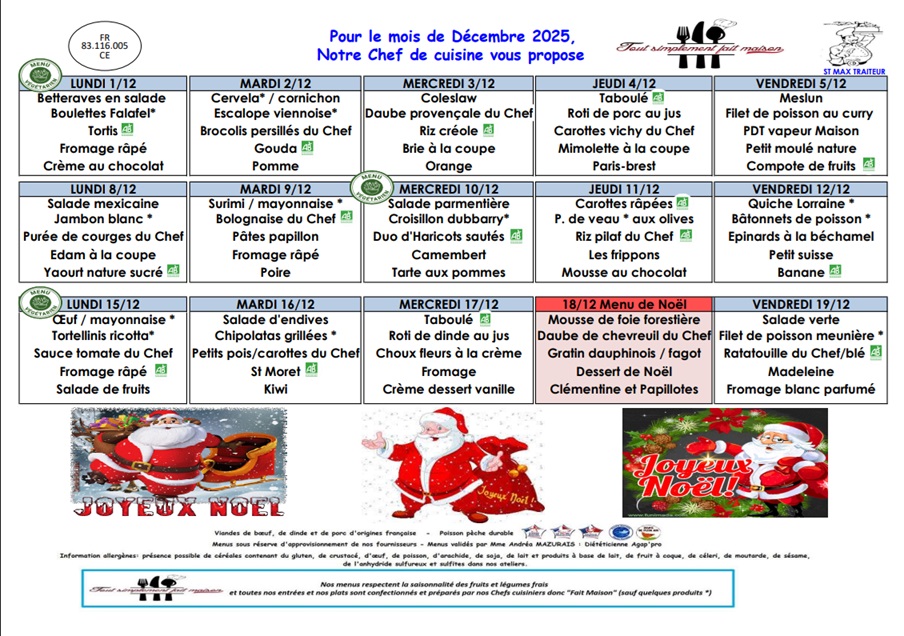 La société Saint-Max Traiteur vous présente le menu de la cantine scolaire pour ce mois de décembre 2025