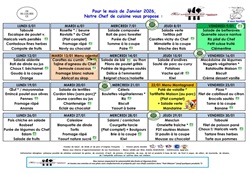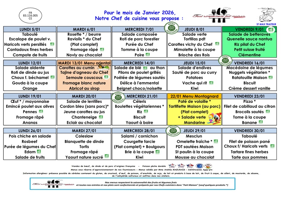 La société Saint-Max Traiteur vous présente le menu de la cantine scolaire pour ce mois de janvier 2026