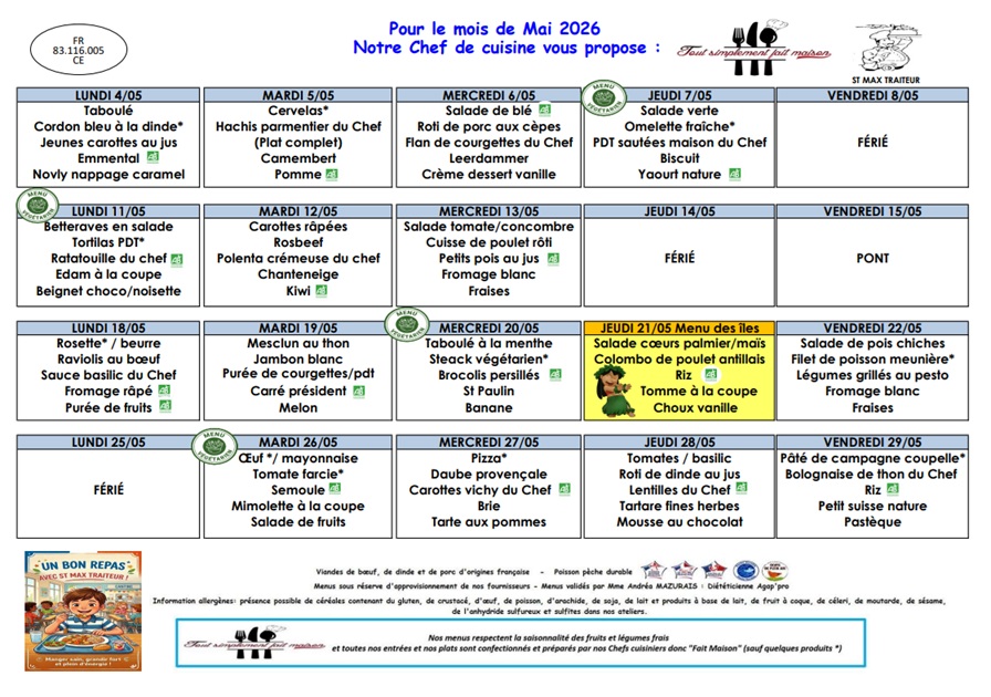 La société Saint-Max Traiteur vous présente le menu de la cantine scolaire pour ce mois de mai 2026
