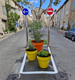Pour concilier sécurisation des lieux et qualité du cadre de vie, la municipalité a installé des bacs de plantes locales (lauriers, oliviers bonsaï, buis) au niveau de la patte-d’oie entre la rue du Moulin et la rue Danton Arnaud.